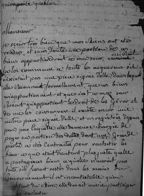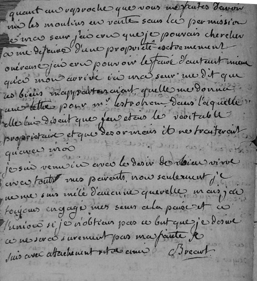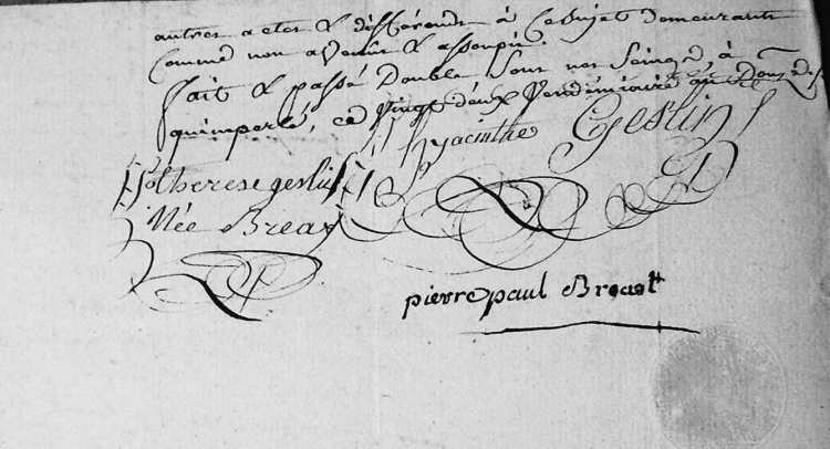 Chateau de Queblen at autres biens à Quimperlé et Mottreff : succession par acte notarié de Paul Bréart de Boisanger, lequel donne l'administration de ses biens à ses trois filles le 9 thermidor de l'an IV : « Devant nous Paul Bréart (Bosanger) lequel a déclaré qu'étant très âgé et presque privé de vue, il déclare par les présentes donner pouvoir et procuration générale et spéciale à Marie Ursule, Marie Joseph, et Thérèse Bréart ses trois filles ». Deux frères, Thomas-Charles et Charles-Laurent, sont décédés respectivement en 1795 et 1787, et le troisième, ainsi que Thomas-Charles est toujours émigré en septembre 1796. Acte de mariage entre Thérèse-Elisabeth-Marie Bréart-Boisanger et Marie-Hyacinthe Geslin : 10 nivôse an IX. Ils s'installent à Quimperlé, sans dans l'immeuble familiale rue de l'Egalité. Acte sous seing privé entre Marie-Hyacinthe Geslin, son épouse et Pierre-Paul Bréart de Boisanger en 1803, afin de préserver au frère Pierre-Paul la possibilité d'hériter d'un troisième lot (incluant vraisemblablement le manoir familial de Queblen) : § Entre nous soussignés Marie Hyacinthe Geslin ... Lettre de Pierre-Paul Bréart à son ami « Monsieur Geslin à Quimperlé », dans laquelle il se plaint de ne pas être compris par sa soeur : § Quimper, Queblen, Monsieur, Je sais très bien que nos biens ... |