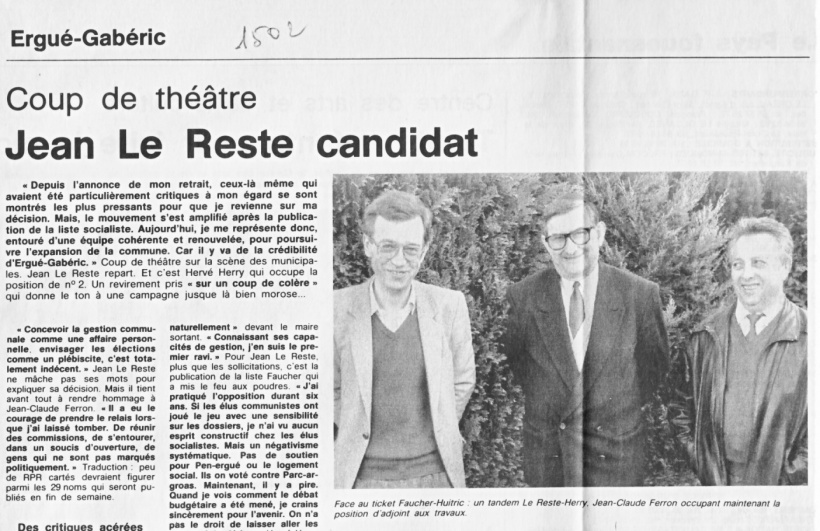 | Le 7 janvier, le 15 février, les 10 et 14 mars 1989 paraissaient dans les colonnes du Ouest-France des articles de Laurent Quevilly sur les élections municipales gabéricoises.