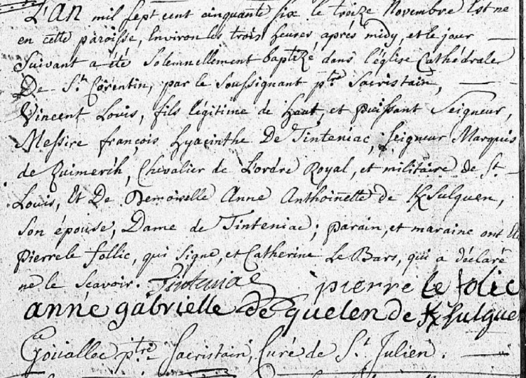 L'inhumation du chevalier Vincent-François dans l'église paroissiale en 1760 est exceptionnelle, tous les autres défunts de la paroisse étant inhumés dans le cimetière. Le 16 août 1719 le Parlement de Bretagne avait totalement interdit les inhumations dans les églises à l'exception des propriétaires d’enfeux Dans un document d'archive dit Minu En 1757 le marquis de Tinténiac s'était illustré lors de la défense du port de Lorient contre les anglais pendant la guerre de 7 ans : « Nous parlerons aussi du Tinténiac, père du chevalier, qui en 1757 sous Louis XV, à la tête de ses Bretons, contribua pour sa grande part à repousser les troupes britanniques qui voulaient s'emparer de Lorient. » (G. de Clohars-Carnoët). La Révolution ayant installé son Directoire à Quimper, François-Hyacinthe de Tintinéac (et ses fils) sont très vite déclarés émigrés :