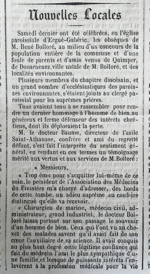 Samedi, 21 mai, ont été célébrées, en l'église paroissiale d'Ergué-Gabéric, les obsèques de M. René Bolloré, au milieu d'un concours de la population entière de la commune et d'une foule de parents et amis venus de Quimper, de Douarnenez, ville natale de M. Bolloré, et des localités environnantes.