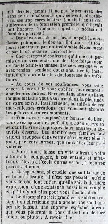 M. le docteur Baume, directeur de l'asile Saint-Athanase confrère et ami du regretté défunt, s'est fait l’interprète du sentiment général, en rendant en ces termes un témoignage mérité aux vertus et aux services de M. Bolloré :