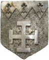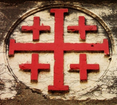 La croix de Terre Sainte est un très ancien emblème des chrétiens d'Orient, formé d’une croix à quatre branches égales, et dont chaque branche se termine par une béquille ou un tau. Dans sa version dite de Jérusalem, elle est composée d'une grande croix grecque cantonnée de 4 petites croix, également grecques, symbole des quatre Évangiles ou des quatre premières Églises chrétiennes après celle de Jérusalem. Le signe, associé au Royaume fondé par les croisés en 1099, figurait sur les monnaies, les mosaïques, les sceaux et les drapeaux. L’ordre du Saint-Sépulcre de Jérusalem, ordre religieux créé par Godefroy de Bouillon après la prise de Jérusalem en 1099, avait à l'origine comme symbole une croix patriarcale latine à double traverse (comme aujourd'hui la croix de Lorraine). Mais, par la suite, l'ordre de chevalerie du Saint-Sépulcre a adopté la croix potencée et les 4 croisettes des armoiries de Godefroy de Bouillon. Bien après les croisades, l'Ordre Équestre du Saint-Sépulcre de Jérusalem, était connu par les adoubements renouvelés des chevaliers selon le cérémonial traditionnel de l'église sur le tombeau du Christ. La croix dite de Jérusalem était aussi le symbole de la Custodie franciscaine de Terre sainte fondée en 1342 par les franciscains qui étaient restés présents en Terre sainte en 1220 après le départ des croisés. |