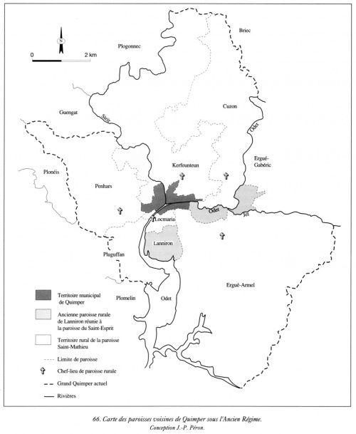 « Au XVIIIe siècle, les Quimpérois se répartissent dans sept paroisses dont trois (Locmaria, Saint-Esprit, Saint-Mathieu) disposent d'un territoire rural. Il est vrai que, au XVIe siècle probablement, une ancienne paroisse, celle de Lanniron, a été supprimée : son territoire fut attribué à celle du Saint-Esprit qui s'agrandit ainsi d'une enclave au sud de Locmaria et s'élargit jusqu'au delà de la confluence entre l'Odet et le Jet, séparée, en quelque sorte, en trois "sections". Cinq de ces paroisses sont desservies dans la cathédrale : il s'agit de la Chandeleur, du Saint-Esprit, de Saint-Julien, de Saint-Ronan et de Saint-Sauveur. Les sept paroisses sont des "vicariats", c'est-à-dire que leurs recteurs sont nommés par un "patron" à l'approbation de l'évêque qui accorde (ou refuse !) son "visa". »