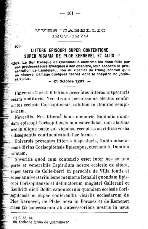 • 1267 - Confirmation des dons des précédents évêques par Yvo Cabellic - Acte P.P. : 103, p. 161-163. Cartulaire de réf. : 56, folio 54.[4]