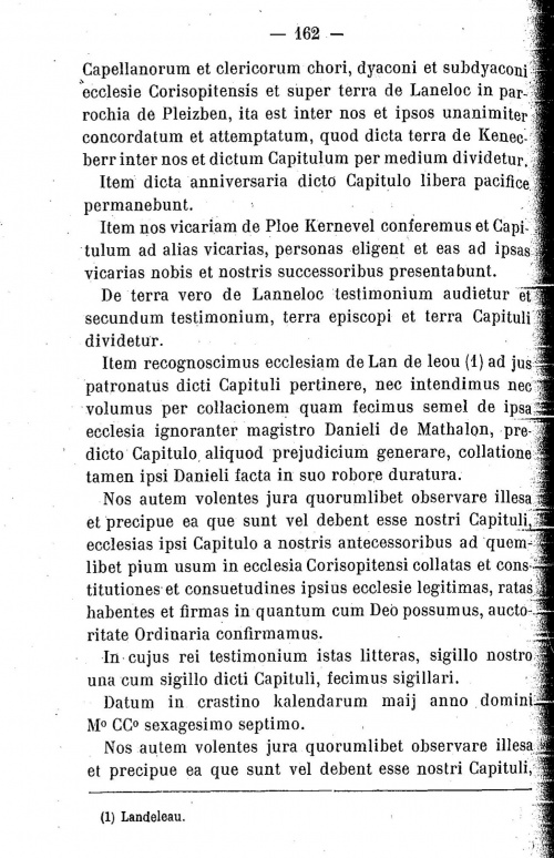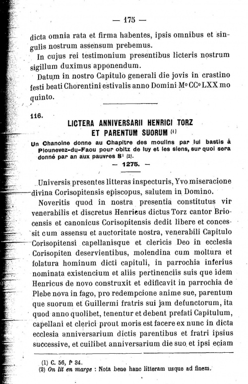• 1275 - Don d'un chanoine pendant l'épiscopat d'Yvo Cabellic - Acte P.P. : 116, p. 175-176. Cartulaire de réf : 56, folio 34. Autre réf. : cart. 31, page 102 du PDF.