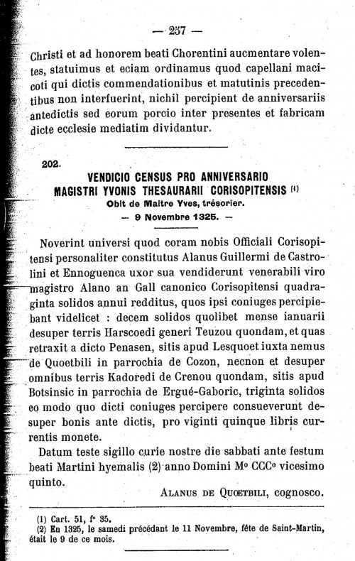 • 1325 - Obit [5] de Maitre Yves, trésorier, concernant le village de Botsinsic en Ergue Gaboric. Acte P.P. : 202, p. 257. Cartulaire de réf. : 51, folio 35.