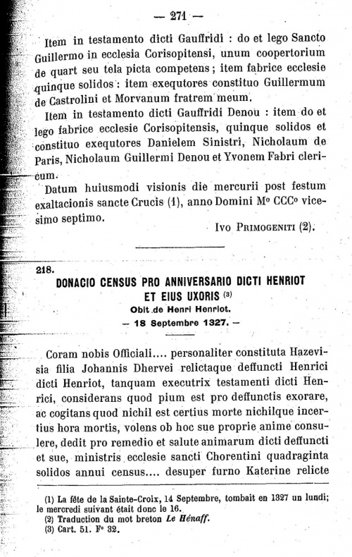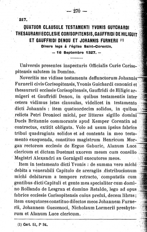 • 1327 - Legs pour Henri Morgan, recteur ecclésiastique d'Ergue Gaburic. Acte P.P. : 217, p. 270-271. Cartulaire de réf. : 51, folio 34.