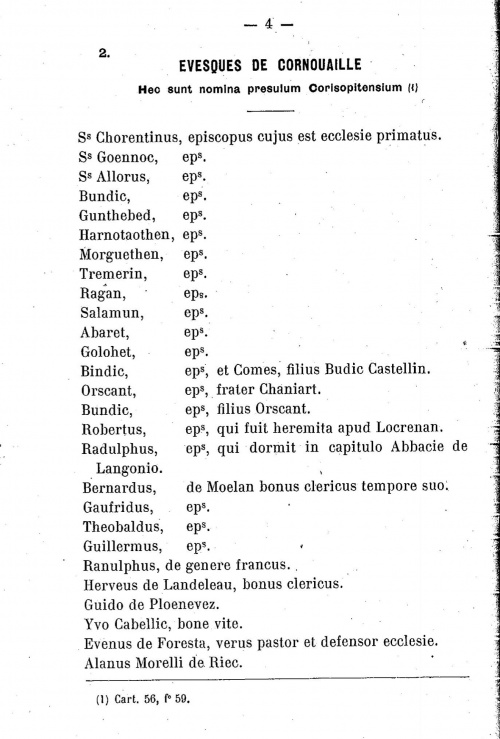 • 1416 - Liste des évêques de Cornouaille dont Yvo Cabellic, bone vite - Acte P.P. 2, p. 4-6. Cartulaire de réf. : 56, folio 59.