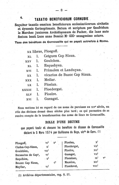 Autres lectures : « 1439 - Testament de Johannes Monachus pour la cire de la chapelle de Kerzevot » ¤ « 1169-1170 - Restitution de la dîme d'Erge par l'évêque dans le cartulaire de Quimper » ¤ « 1325 - Obit de trésorier concernant Botsinsic en Ergue Gaboric dans le cartulaire de Quimper » ¤ « 1327 - Legs en présence du recteur d'Ergue Gaburic dans le cartulaire de Quimper » ¤ « 1267-1279 - Actes du cartulaire de l'église de Quimper relatifs à l'évêque Yvo Cabellic » ¤ « 1368 - Taxe des bénéfices payée à Rome pour Ergue-Gabic dans le cartulaire de Quimper » ¤ « LE MEN René-François - Monographie de la cathédrale de Quimper » ¤