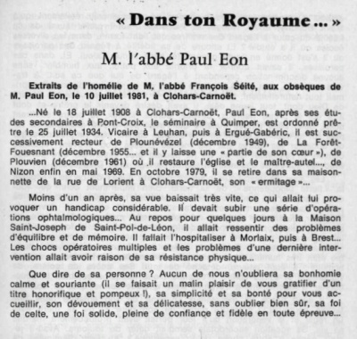 Après Yves Le Goff et Auguste Hanras, il assure les fonctions de d'aumônier à la papeterie d'Odet. Après guerre, après la découverte de statues cachées dans une cheminée du patronage de l'Hôtel, il fait don d'un saint polychrome à une famille résidente d'Ergué-Gabéric : « Paul Eon, vicaire (1939-1949) » |
