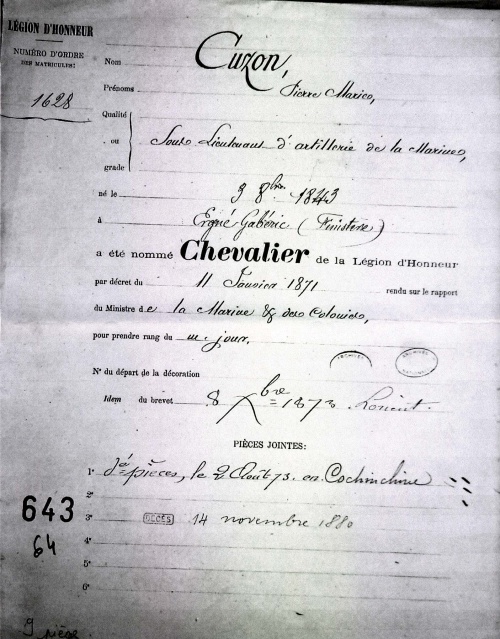 Par décret du 11 janvier 1871 Pierre Marie est nommé « Chevalier de la Légion d'Honneur » avec le rang de 24718 sur la liste des membres de l’ordre recevant le traitement. C’est donc à la suite de sa campagne contre l’Allemagne qu’il a obtenu cette décoration exceptionnelle. Il est déjà en Cochinchine lors de la notification. Il n’est alors que Sous-Lieutenant et passe au grade de Lieutenant à la fin de cette même année 1871. Sur les documents liés à sa nouvelle situation nous apprenons qu’il change de département en étant transféré de Lorient dans le Morbihan à Brest dans le Finistère, le 1er janvier 1878. |