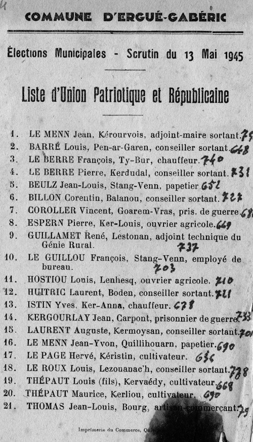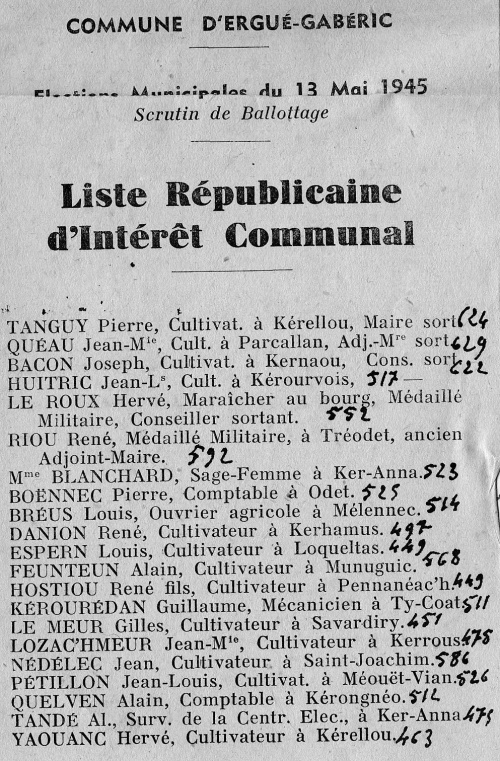 En 1929, Pierre Tanguy est la tête de liste U.R.D. (Union Républicaine Démocratique) À son élection en 1929, le bulletin paroissial ne cache pas sa satisfaction : « Le troisième dimanche de Mai a eu lieu l'élection du Maire et des adjoints. M. Pierre Tanguy a été nommé Maire par 14 voix ; MM René Riou, 14 voix, et Jean-Marie Quéau, 13 voix, ont été élus Adjoints. Ce choix est excellent et fait honneur au Grand-Ergué qui met à sa tête les hommes les plus instruits et les plus sympathiques de la commune. Avec de tels hommes nous sommes sûrs que les affaires de la commune seront bien gérées. »