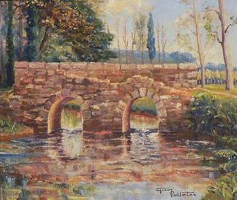 - Gaby Pelleter est né à Primelin le 9 octobre 1910. Il avait 3 ans quand ses parents sont venus habiter Brest où il a suivi toute sa scolarité. A l’âge de 19 ans, il entre dans la Marine. En 1942, il quitte Toulon avec sa famille, à la suite du sabordage de la Flotte. C’est alors qu’il se réfugie à Ergué-Gabéric, à Lestonan, où vivaient deux sœurs de son père. Il y restera, logeant chez le boucher Michel Henry, du 16 décembre 1942 au printemps 1945, partageant sa vie entre la peinture et la Résistance. Autodidacte, possédant un don certain, c’est à Ergué-Gabéric qu’il s’est affirmé en peinture, après ses premiers essais à Toulon. Puis les cours aux Beaux-Arts ont fait le reste... En disponibilité de la Marine, ne recevant donc pas de solde, il s’est mis à peindre et à vendre ses tableaux des fermes, forges et autres lieux d’Ergué-Gabéric. Après la guerre, sa famille retournera sur Brest pendant qu’il retrouvait la Marine jusqu’en 1948. De retour à la vie civile, il consacrera sa vie active à la décoration, trompe-l’œil, tableaux, etc…À sa retraite, malgré un déficit visuel, il s’est surtout tourné vers les miniatures ... [Ref.↑]