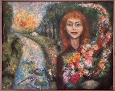 À l'époque, dans toutes les salles de cinéma de France, les grands films étaient précédés il y avait de la pub, des actualités et un court-métrage. Et Gwenn-Aël Bolloré et son épouse ont produit ensemble un certain nombre de « courts », la plupart sur les thèmes de la mer, la pêche et l'océanographie. Leur fille Anne témoigne : « Pour chacun de ces films, mon père demandait à un artiste de réaliser un portrait de Maman qui servirait de fond pour le générique. » L'un d'entre eux intitulé « L'Odet », filmé en noir-et-blanc, démarre par le visage souriant de Renée Cosima. Le tableau original (cf. ci-dessous) réalisé par Edouard Goerg est encore plus attrayant avec ses couleurs chatoyantes : on la voit portant une corne d'abondance ou un grand bouquet de fleurs, et en arrière-plan, en vue plongeant depuis le manoir familia d'Odet, coule la rivière avec ses poissons, un pêcheur et un lièvre. Edouard Goerg (1893-1969), élève des "bretons" Paul Sérusier et Maurice Denis, est un peintre majeur de l’expressionnisme français, son œuvre se caractérisant par des couleurs profondes et des compositions étranges. |