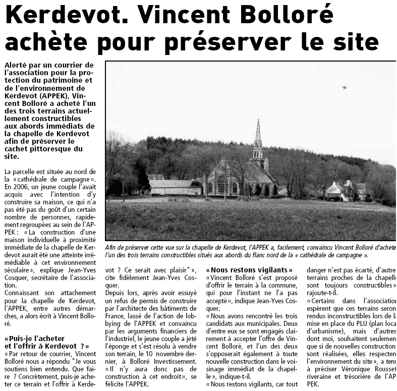 • l'APPEK (Association pour la Protection du Patrimoine et de l'Envronnement de Kerdévot) a attiré l'attention de Vincent Bolloré sur les risques de dégradation du site religieux et naturel par la construction de maisons individuelles.