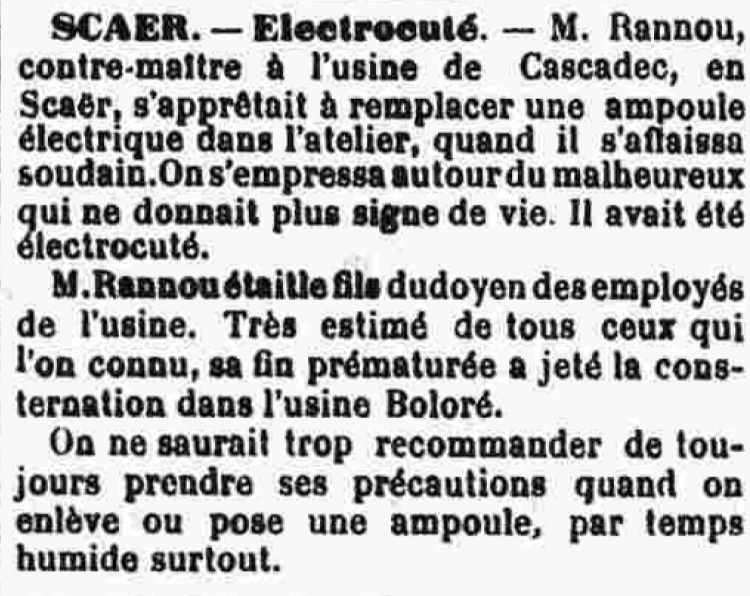 En janvier 1926, un accident et un drame à Cascadec : Emile, le fils du contremaitre René Rannou, travaillant également à la papeterie, est mort électrocuté. Les journaux témoignent de l'émotion des papetiers : « Emile Rannou était né dans une vieille famille chrétienne d'Ergué-Gabéric ... Obéi de tous, il sut donner l'impulsion nécessaire aux multiples rouages de Cascadec. Il fallait le voir traversant les ateliers, un bon mot pour chacun ».