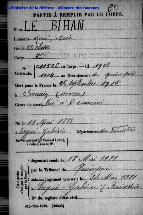Et quelques jours plus tard : François Cloarec (29.09.1915, Perthes), Yves Riou (04.10.1915, Tahure), Pierre Marie Poriel (06.10.1915, Mesnil-Lès-Hurlus) |