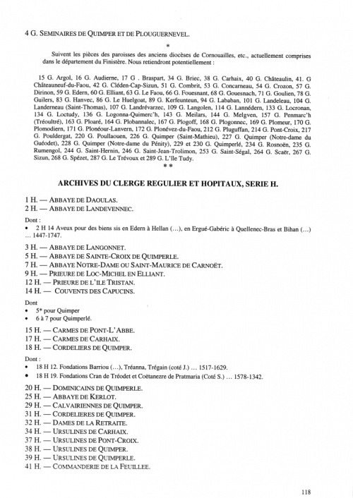 Ci-dessus les documents "H- abbayes, prieurés, couvents et communautés, ordres militaires religieux, hôpitaux ou aumôneries" et les articles correspondants du site GrandTerrier. Autres lectures : « Espace Inventaires des Archives » ¤ « Archives départementales du Finistère » ¤ « BERNARD Norbert - Chemins du Ve au XVIIe siècle à Ergué-Gabéric * Sources et bibliographie » ¤ |