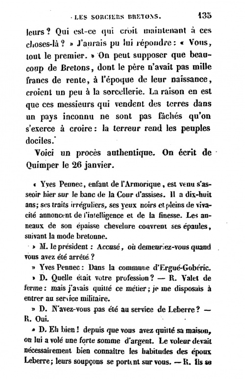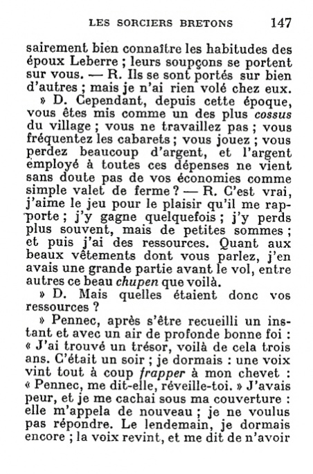 Ce chapitre est illustré par le procès en sorcellerie du valet de ferme Yves Pennec d'Ergué-Gabéric, avec citations et quelques commentaires, le tout sur 7 pages. Il y affirme qu'« il y a beaucoup de sorciers en Bretagne, du moins c'est ce que je devrais croire d'après le témoignage à peu près universel ... On peut supposer que beaucoup de Bretons, dont le père n'avait pas mille francs de rente, à l'époque de leur naissance, croient un peu à la sorcellerie. ».