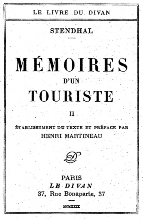 STENDHAL (), Mémoires d'un touriste, tome II, Ambroise Dupont, Paris, 1838, ISBN -