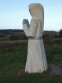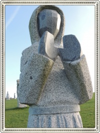 Sa tête est recouverte d'une cagoule, avec une longue pointe à l'arrière. La figure lisse, constituée de multiples facettes et ornée d'un œil droit en tâche sombre, ressemble à un masque de divinité. Cette représentation faciale symbolique est sans doute liée à la beauté légendaire du fils de Romélius et de Laetitia : « filius elegantis formae, vultus angelici, Guenailus nominatur » ("fils d'une beauté exceptionnelle, au visage d'ange, il reçoit le nom de Guénaël", Vita seconda sancti Guenaili). Sur la ceinture de son habit de moine, sont gravées les inscriptions suivantes : « ST GWENNAEL » à l'arrière, « LOUISON » (assistant sculpteur ?) sur le côté sud, et « ALI LEO » (signature Le moine présente en avant les paumes de ses mains ouvertes, dans un geste d'apaisement et d'absence de peur, un peu comme une « mudrā » La statue est placée sur le bord ouest de la colline du site de Carnoët, le regard dans la direction du sud-ouest, probablement vers le pays de sa naissance et son enfance, à savoir Ergué-Gabéric près de Quimper. |