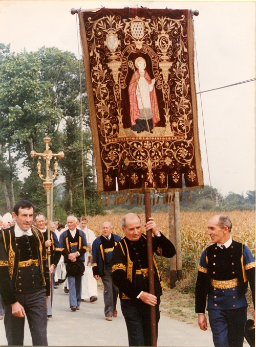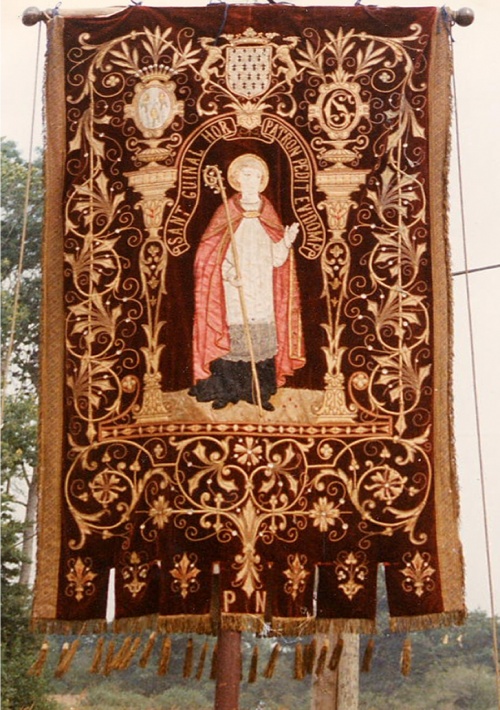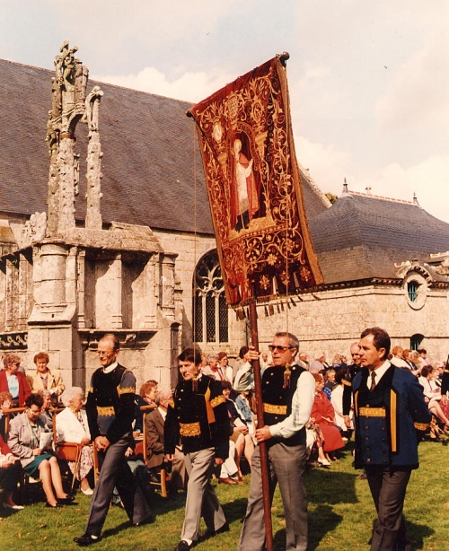 Et la bannière portent les initiales P.N. (probablement N comme Nédélec). La bannière fut l'objet d'une donation de François Nédélec de Kergoant après un vœu d’intercession au début de la dernière guerre mondiale pour la protection des soldats membres de la famille.