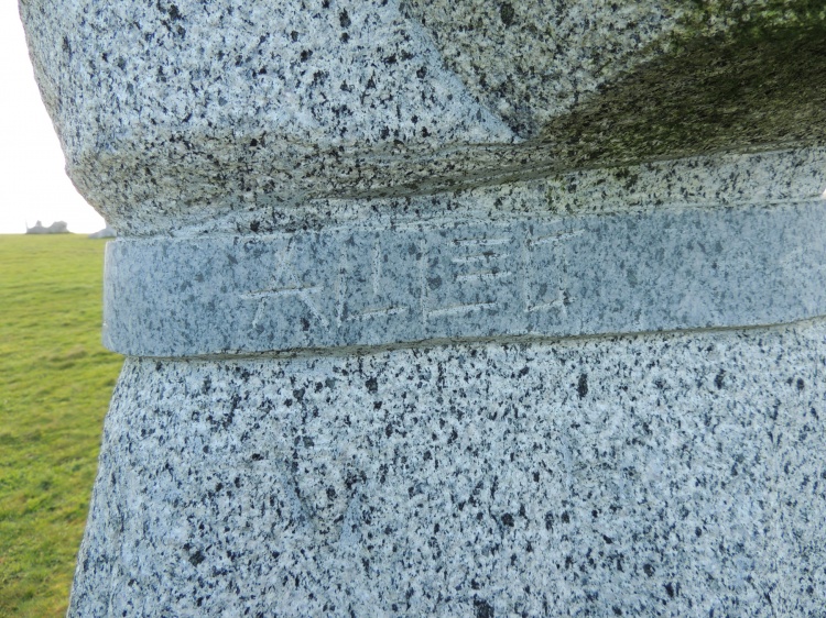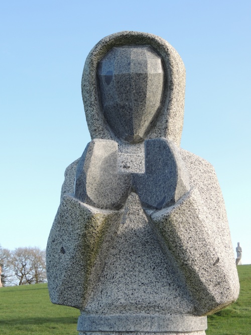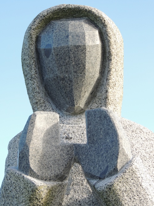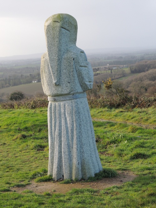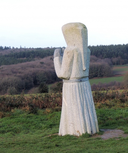 Sa tête est recouverte d'une cagoule, avec une longue pointe à l'arrière. La figure lisse, constituée de multiples facettes et ornée d'un œil droit en tâche sombre, ressemble à un masque de divinité. Cette représentation faciale symbolique est sans doute liée à la beauté légendaire du fils de Romélius et de Laetitia : « filius elegantis formae, vultus angelici, Guenailus nominatur » ("fils d'une beauté exceptionnelle, au visage d'ange, il reçoit le nom de Guénaël", Vita seconda sancti Guenaili). Sur la ceinture de son habit de moine, sont gravées les inscriptions suivantes : « ST GWENNAEL » à l'arrière, « LOUISON » (assistant sculpteur ?) sur le côté sud, et « ALI LEO » (signature Le moine présente en avant les paumes de ses mains ouvertes, dans un geste d'apaisement et d'absence de peur, un peu comme une « mudrā » La statue est placée sur le bord ouest de la colline du site de Carnoët, le regard dans la direction du sud-ouest, probablement vers le pays de sa naissance et son enfance, à savoir Ergué-Gabéric près de Quimper. |