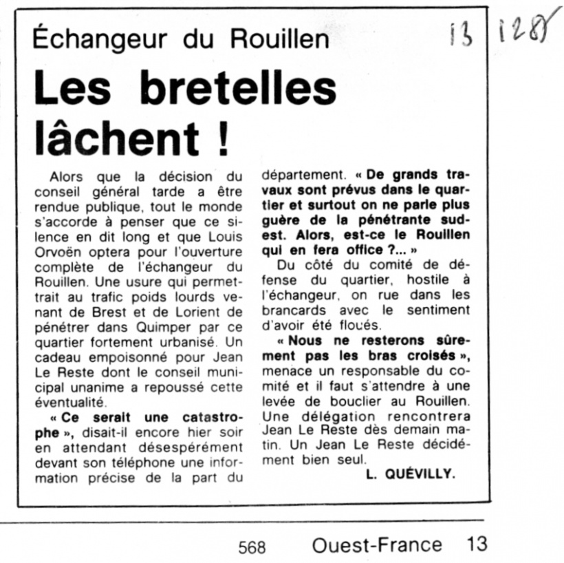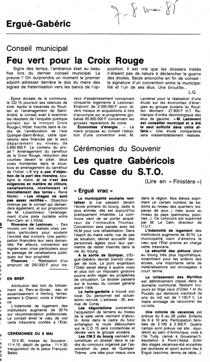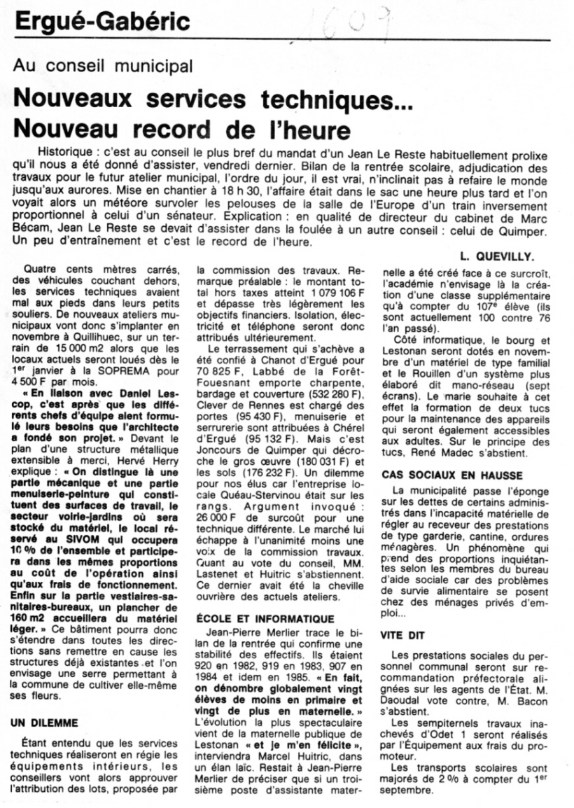 | Le 7 mai, le 16 septembre, les 21 et 29 novembre, les 10 et 13 décembre 1985, paraissaient dans les colonnes du Ouest-France des articles de Laurent Quevilly portant sur les conseils et services municipaux.