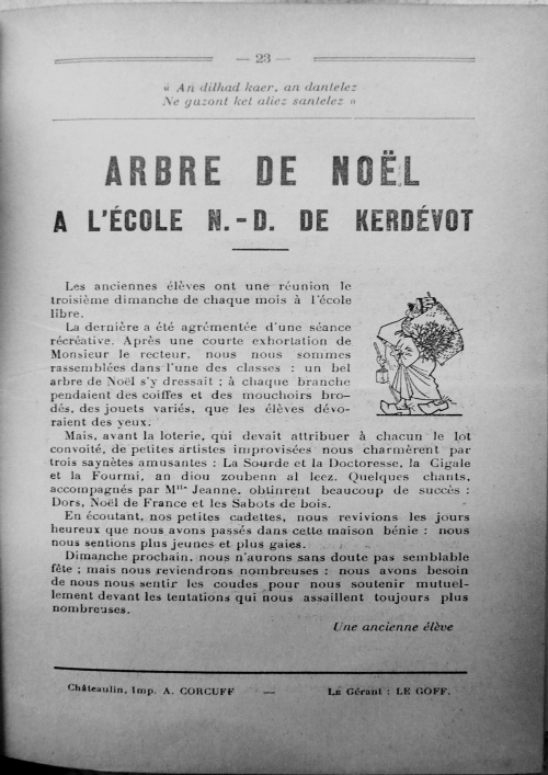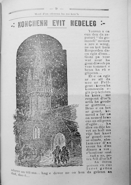 Outre les sermons habituels et des explications religieuses en breton, le bulletin de décembre 1927 inclut le conte « Konchenn evid Nedelec » (une histoire pour Noël) dont le héros est Youenn et qui commence par « Et e oa egiz ar re all da noz ar Pellgent » (il avait été à la nuit du Pellgent). La fête avait été très belle cette année-là : « Brao e oa bet ar gouel ». Le 25 décembre 1936 est organisée au patronage d'Odet, après les vêpres, une après-midi récréative avec les chants des enfants, et en apothéose une véritable pièce interprétée par la troupe de théâtre de Keranna : « Ce fut ensuite une désopilante pièce bretonne : "Trubuilhou ar seiz tortig", enlevée par les jeunes gens, et qui fit épanouir une franche gaité ! ». Le premier mot du titre de la pièce peut être traduit en français par "tribulations" ; quant aux « ar seiz tortig » qui seraient les sept bossus, on est dubitatif car une pièce de Loeiz ar Floc'h, très connue à l'époque, s'intitulait « Trubuilhou ar seiz potr yaouank » (les tribulations des sept jeunes gars). Peut-être que derrière les "sept bossus" se cachaient les sept jeunes prétendants de la belle Agnès ? |