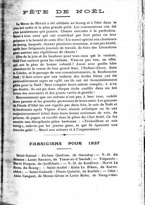 En parcourant les Kannadigs de 1936 à 1937, on devine l'importance de la fête de Noël au début du XXe siècle, avec les assistances bien four-nies aux cérémonies religieuses, mais aussi dans les autres rassemblements plus festifs où petits et grands venaient également nombreux (loteries dans les écoles, théâtre au patronage).