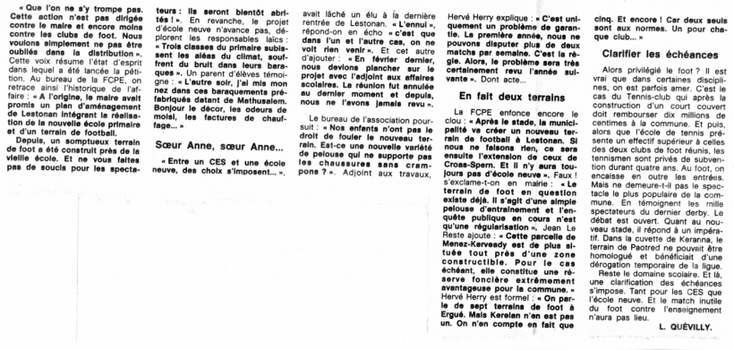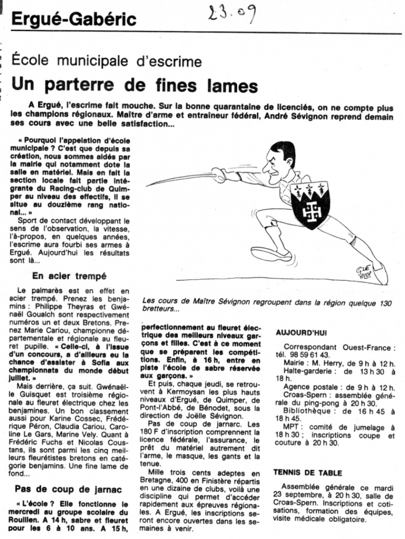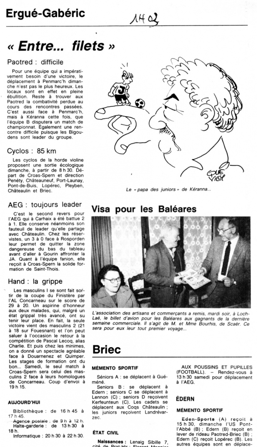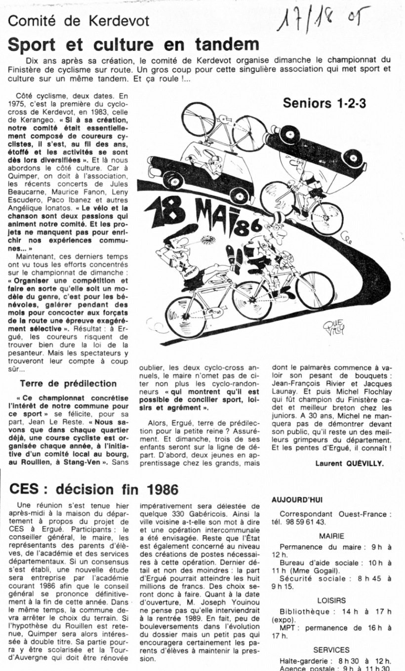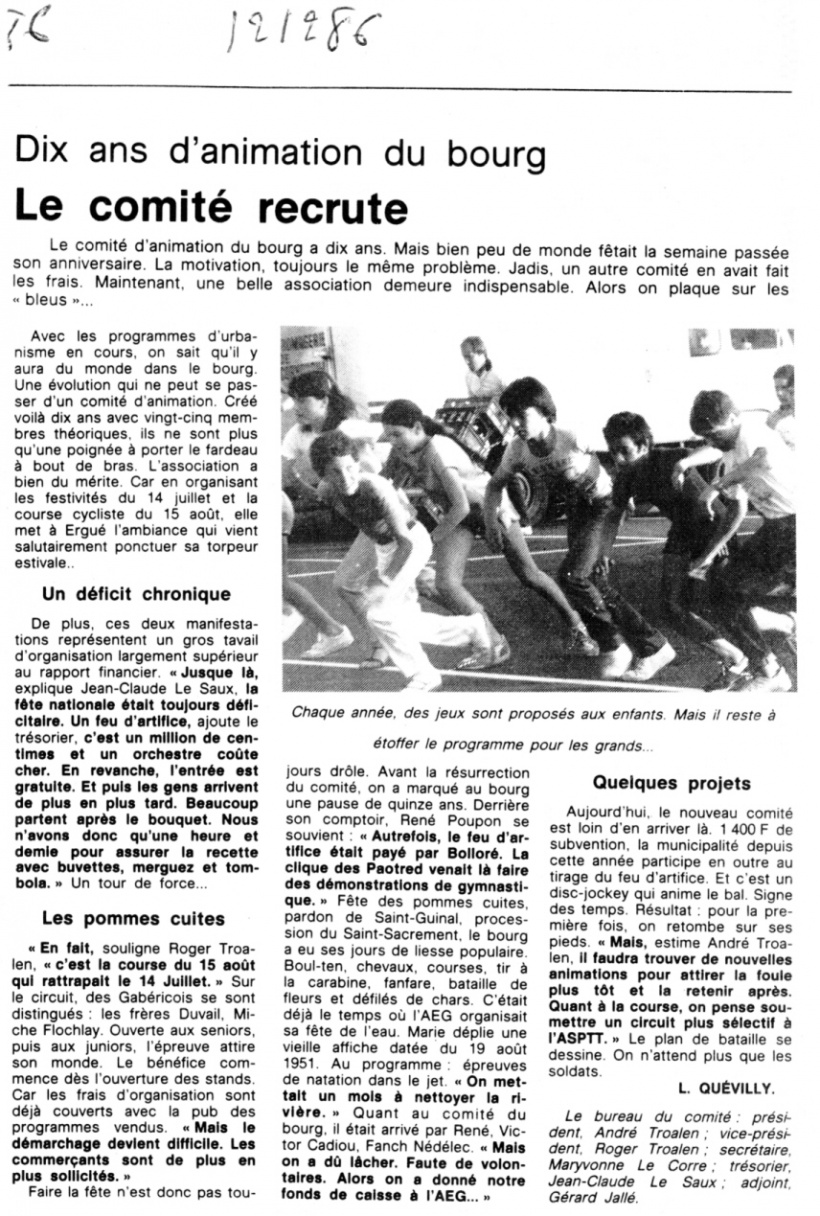 Le 7 février, le 14 mars, les 15 et 17 mai, le 31 juillet, le 23 septembre, les 16 et 18 octobre, le 12 décembre 1986 paraissaient dans les colonnes du Ouest-France des articles de Laurent Quevilly sur les clubs sportifs gabéricois.