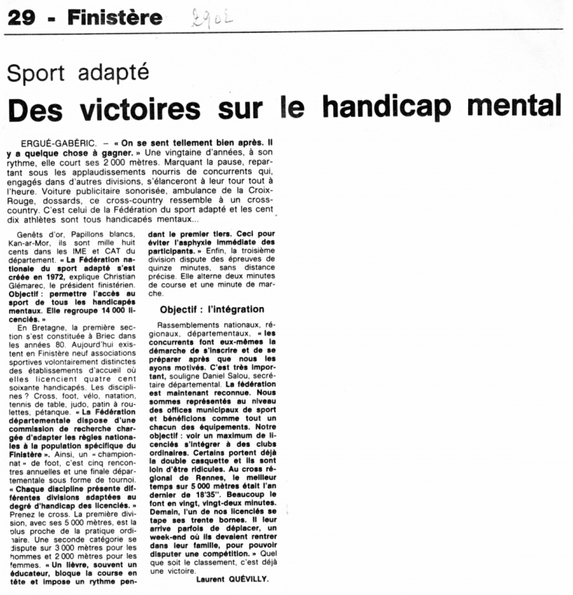 | Le 27 février 1988 paraissait dans les colonnes du Ouest-France un article de Laurent Quevilly sur la pratique du sport par tous.