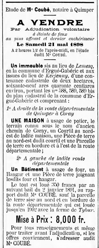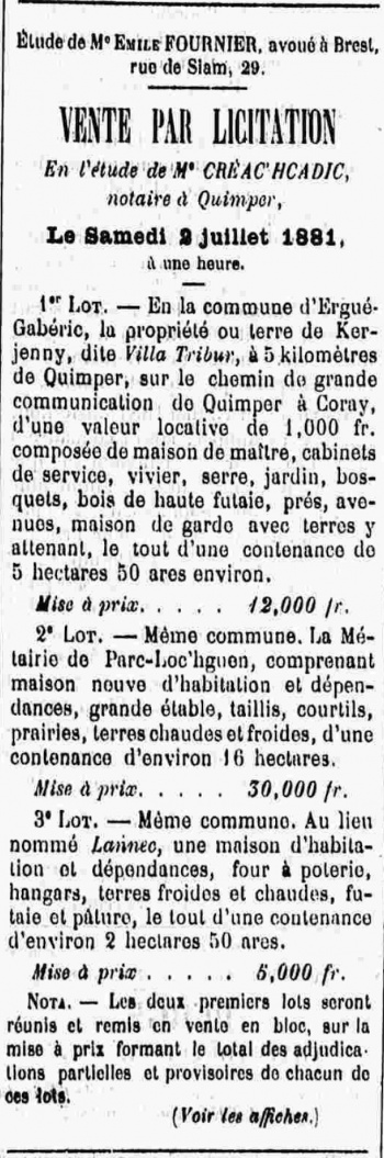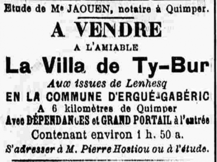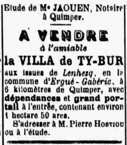 Le nom de Villa de Ty-Bur est cité dans les journaux de 1881, 1898 et 1920 lors des ventes de la propriété, avec également dans les annonces la mention de Kerjenny désignant le hameau, alors que Ty-bur est la ferme agricole. On peut rappeler que les lieux ont aujourd'hui changé par le nouveau tracé de la route de Coray au 20e siècle et le déplacement du portail de la propriété plus au sud, alors qu'il était auparavant orienté le long de la grande route.