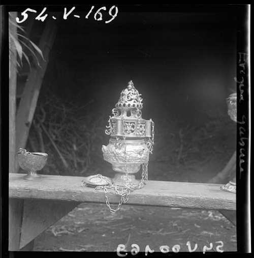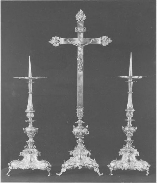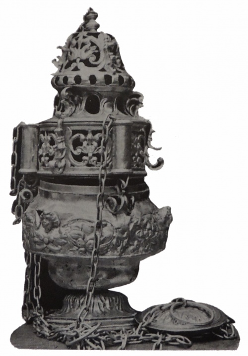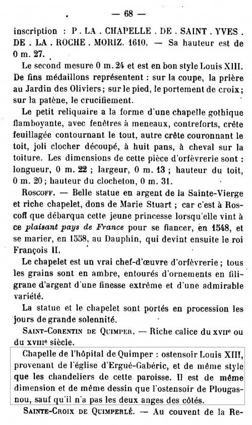 Pour ce qui concerne l'encensoir (cf photo Le Doaré ci-contre), de l'époque Louis XIX et du maître orfèvre Joseph Bernard de Quimper, Auzas écrit : « Bien peu ont été conservés et bien peu sont en bon état, car ils sont malmenés par les enfants de chœur ... L'encensoir se compose de deux parties : la coupe avec pied, qui parfois, comme à Ergué-Gabéric (F.), est décorée de têtes d'angelots ailés rapportés et de gros fruits, et le couvercle ajouré. Un système de chaînes réunit le tout et permet le balancement et l'encensement. » Pour les chandeliers d'autel il précise : « Le seul bel ensemble que nous connaissions est celui de l'église Saint-Guénaël, à Ergué-Gabéric (F.), qui comprend, avec la croix d'autel, six chandeliers (2 grands, 2 moyens, 2 petits). L'ensemble est d'époque Louis XIV, et probablement parisien. ». Les hauteurs et largeurs de pieds de la croix et des chandeliers en cm sont les suivantes : la croix, h=80, la=20 ; les 2 grands, h=58,5 ; la=20 ; les 2 moyens, h=57, la=19 ; les 2 petits, h = 53, la = 17 ; les deux grands chandeliers ont perdu leurs têtes d'angelots ailés de nœud. Louis Le Guennec complète dans le bulletin de la Société d'Archéologie du Finistère : « L'église d'Ergué-Gabéric possède six beaux chandeliers d'argent du XVIIIe siècle, trois grands, trois moyens et trois petits. Ces derniers ont une ornementation soignée, décelant le faire d'un habile orfèvre. J'y ai relevé deux types de poinçons, un T surmonté d'une couronne, qui pourrait être la marque du bureau de Quimper à l'époque, et deux fleurons ou fleurs de lys superposées, surmontées d'une couronne, avec la lettre A accolée à la fleur inférieure. Sur le pied de deux ou trois de ces chandeliers sont les trois lettres séparées B. A.R. Il y a aussi une jolie croix d'argent ayant pour unique poinçon le T couronnée. » |