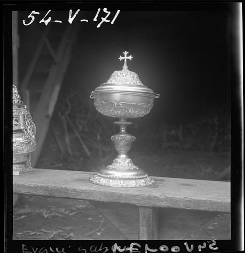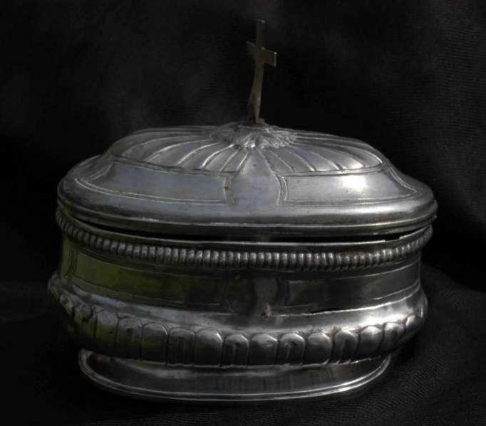 - Ciboire, s.m. : vase sacré, utilisé dans plusieurs liturgies chrétiennes. En général fermé d'un couvercle surmonté d'une croix, il est destiné à contenir les hosties consacrées par le prêtre durant la cérémonie eucharistique, soit pour les distribuer aux fidèles au moment de la communion, soit pour les conserver dans le tabernacle ou l'armoire liturgique (Wikipedia). [Terme] [Lexique] [Ref.↑ 4,0 4,1]