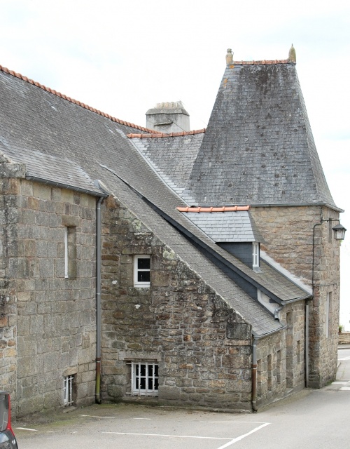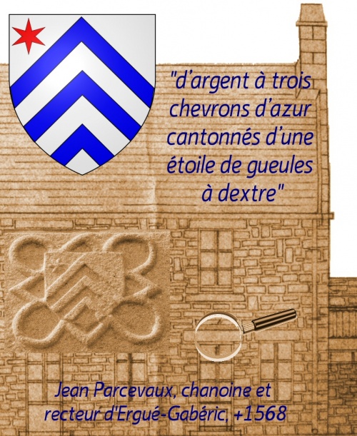 Le blason du presbytère à trois chevrons et une étoile à six branches appartenait à Jean Parcevaux Selon Guy Autret de Missirien et de Lezergué Le chanoine était le demi-frère, du premier mariage d'Yvon avec Marie Kergoannec, de :