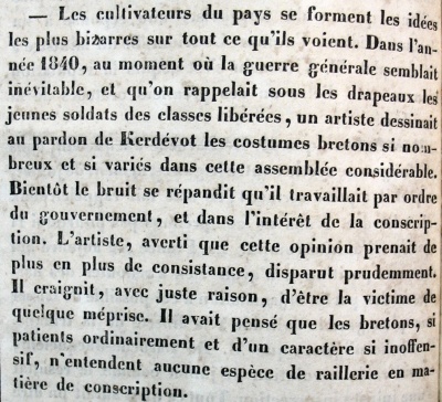 Cet entrefilet Pourquoi les paroissiens de septembre 1840 étaient-ils si méfiants via-à-vis des conscriptions nationales ? Adolphe Thiers, président du conseil de la monarchie de Juillet depuis le 1er mars 1840, avait mené une politique étrangère en Egypte contre les autres puissances européennes (Royaume-Uni, Autriche, Prusse et Russie). Devant la menace de ces derniers, il dut décréter le 29 juillet la mobilisation des soldats des classes 1836 à 1839 et faire commencer les travaux des fortifications de Paris. En 1840 la population était très réticente à envoyer ses enfants sur le front. L'article rappelle le contexte : « Dans l'année 1840, au moment où la guerre générale semblait inévitable, et qu'on rappelait sous les drapeaux les jeunes soldats des classes libérées ». De plus la conscription était organisée au tirage au sort car seuls 30 à 35 % des conscrits célibataires ou veufs sans enfant effectuaient leur service militaire. Une mobilisation n'était pas la bienvenue, et en région les esprits étaient bien échauffés : « Les bretons, si patients ordinairement et d'un caractère si inoffensif, n'entendent aucune espèce de raillerie en matière de conscription, dit l'article. Cette situation changera dans les décennies suivantes jusqu'à la mobilisation de 1870. Et à Kerdévot on organisera même en ces 1870 et 1871 des pardons et des pèlerinages en l'honneur des jeunes soldats partis ou revenus du front prussien. |