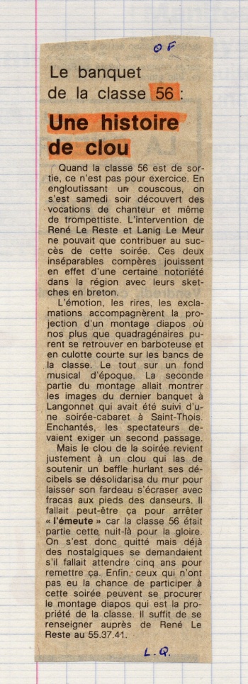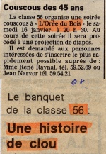 | En janvier 1982 paraissait dans les colonnes du Ouest-France un article de Laurent Quevilly sur le repas de la classe 56 à l'Orée du Bois autour d'un couscous. René Le Reste avait invité son copain Lannig Le Meur et les histoires s'enchainèrent.