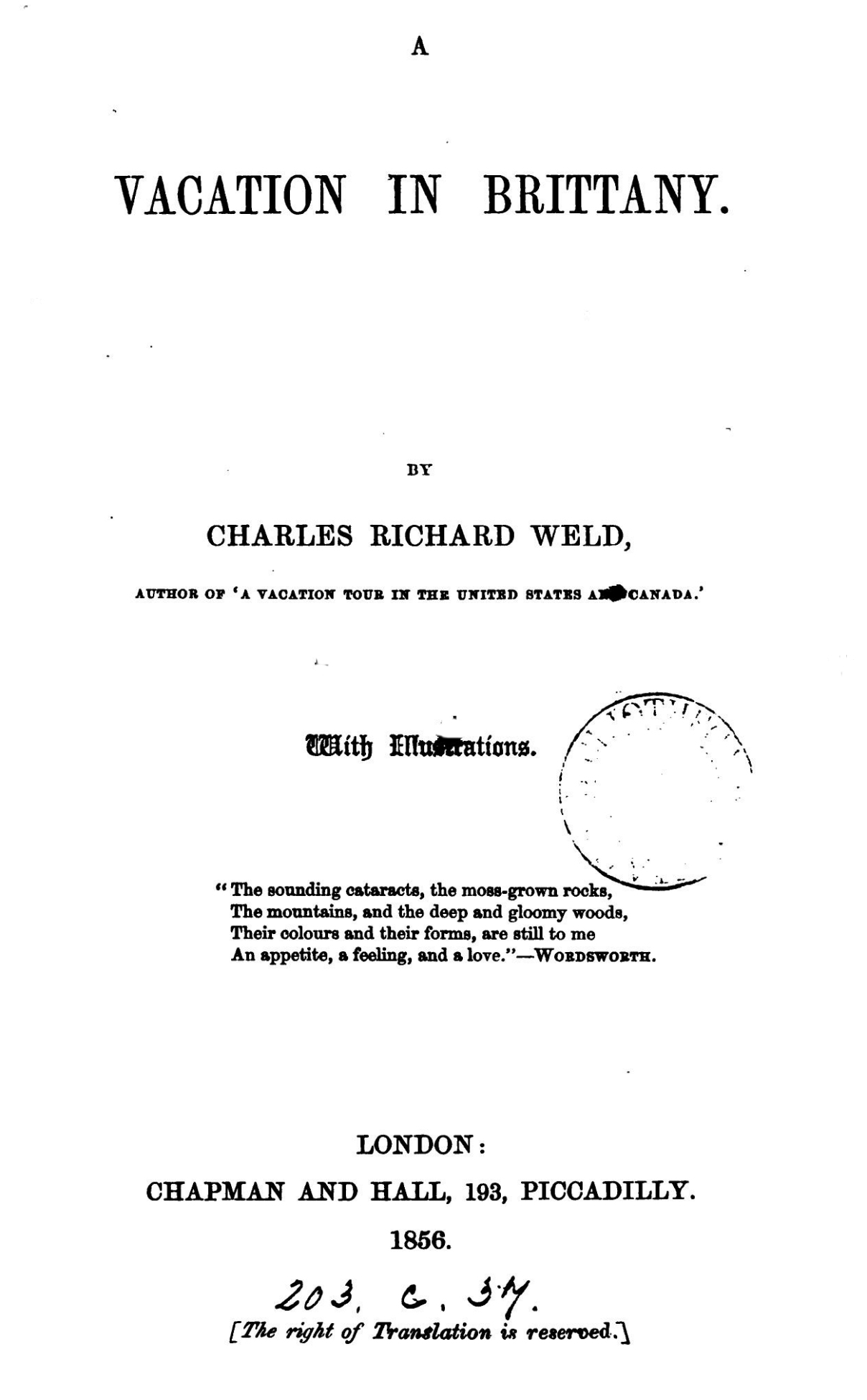 Comme la nuit tombait, la gaieté et les amusements prenaient un tour plus bruyant, et des scènes qui attestent que la distanciation morale proverbiale entre Dieu et l'Eglise est une réalité en Bretagne ; car les murs gris de St Kerdévot, à l'intérieur desquels beaucoup de prières ont été murmurées en matinée, disparaissent, alors que la lune recouvre d'une teinte argentée les fleurons de son clocher, sur fond de